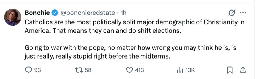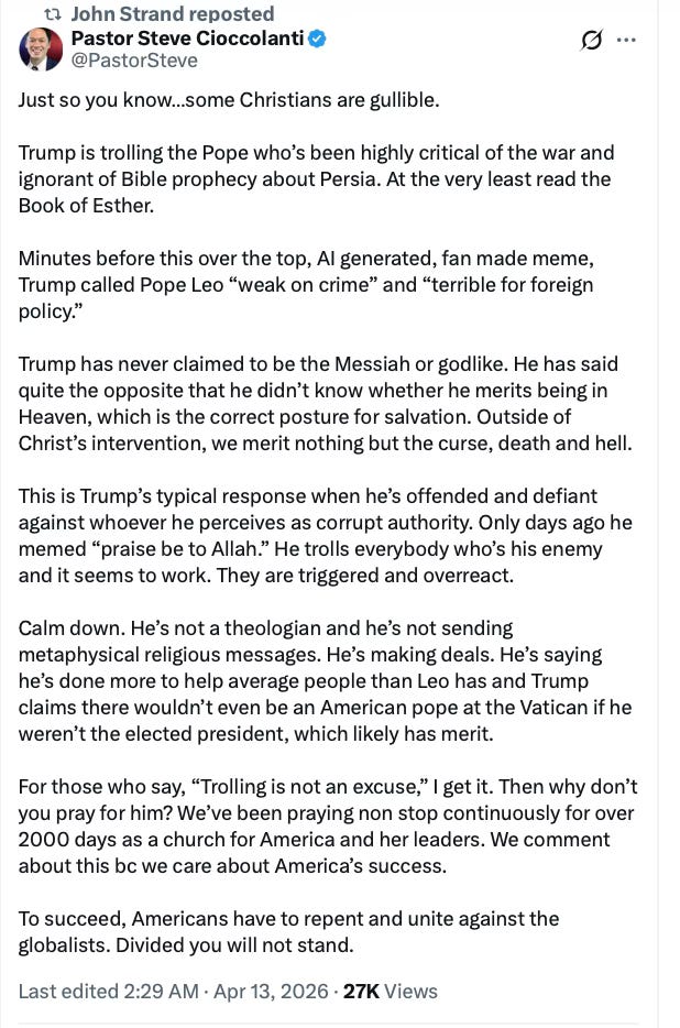 Giving Trump the benefit of the doubt is becoming harder for many of his supporters, especially those who are devout Christians. Does it really pivot that hard from “Iran will cost him the midterms” to “No, a meme will”? It seems to me that a faction of the Right has already accepted losing the midterms. They just need the best reason to hand power back to the Democrats.