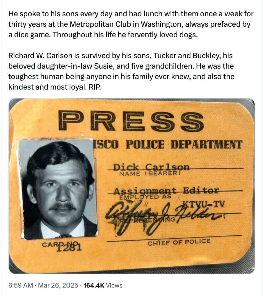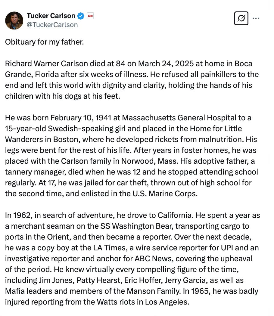 Tucker Carlson has what few people on the Left or the Right have: talent. This obit is an example of that. Note the one line, “When his wife departed for Europe and never returned…” he’s speaking about his own mother who abandoned her two children and left the father to raise them alone. That is obviously a very painful memory for him, but he expends no energy on that sentence. Instead, he gives it all to the man who is clearly his hero. We can see why. RIP.