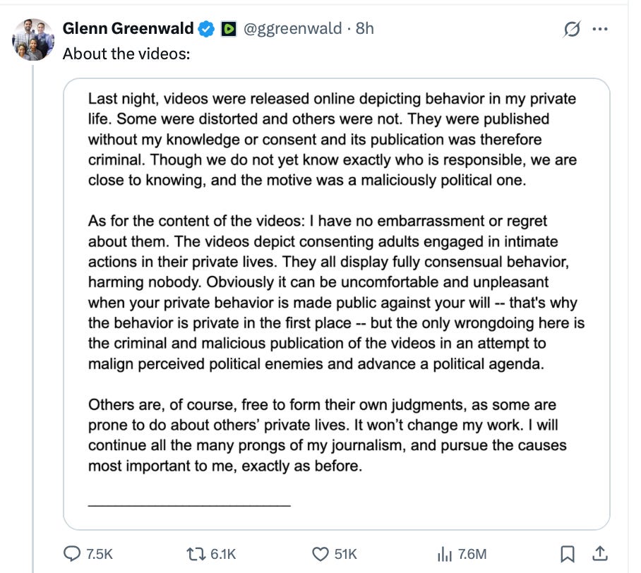 Today, Glenn Greenwald addressed some leaked sex tapes that have been making the rounds. The Tucker video was recorded before that happened, I believe.
