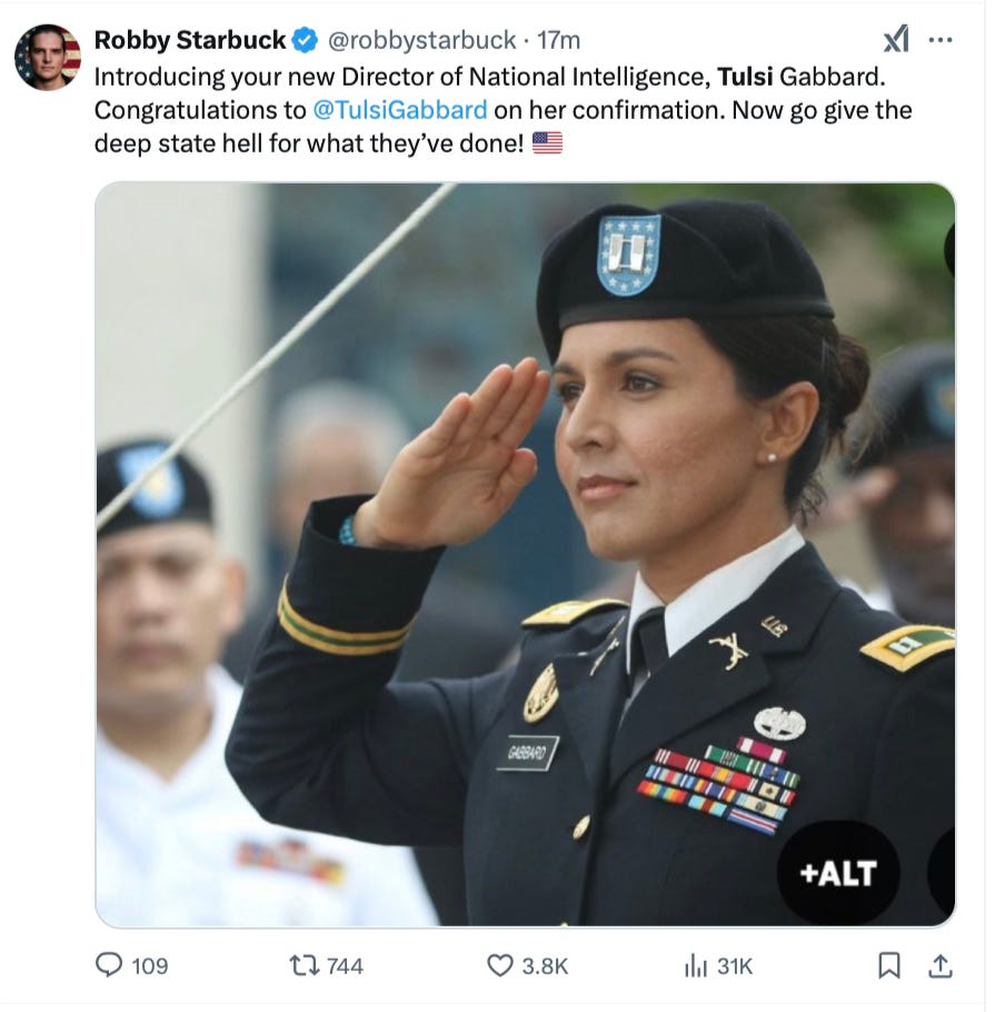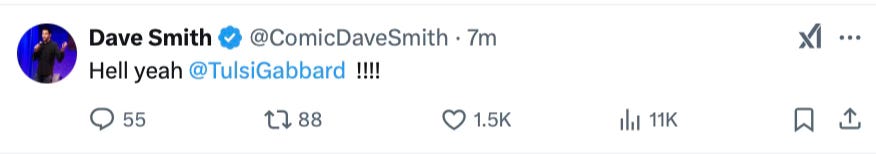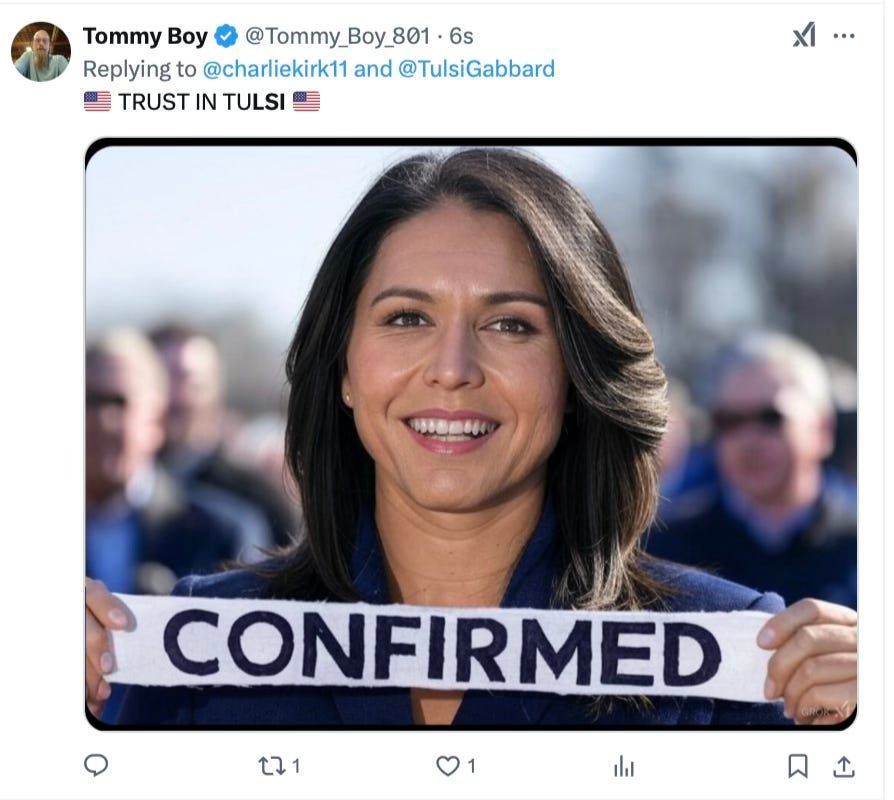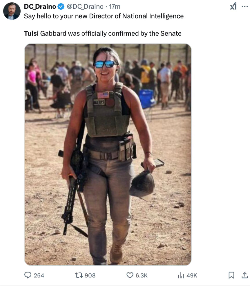 Tulsi Gabbard Confirmed!Sasha StoneFeb 12, 202550519436ShareShe was supposed to be the hardest confirmation but she has sailed through with a 52-majority vote in the Senate. That is astonishing. Makes me a little misty-eyed, I have to admit. PreviousNext