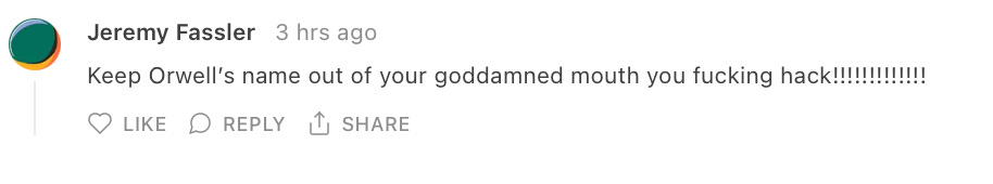 So this comment is interesting because he’s channeling Will Smith, who said, right before slapping Chris Rock across the face, “Get my wife’s name out of your f*cking mouth.” So there is a small bit of simmering violence in it. He’s also claiming Orwell for himself while spewing invective at me every so often when it all becomes too much for him, and he needs a release valve.