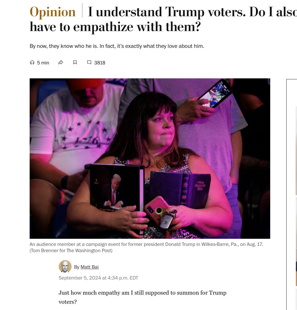 We can’t separate them, argues Bai. If they support Trump then they are the named enemy. They are not worthy of our empathy, at least not until — he hopes — Kamala Harris wins the presidency. Then, they might thaw out and treat them like they belong in the country they love. Don’t bet on it. Bai writes: