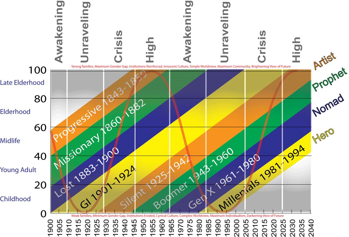 The turnings of these generations cycle through an awakening, an unraveling, and a crisis. The way I always find my way through it is knowing that the last fourth turning was in 1943. The big events that altered the course of Western society were World War II, how that started, how it ended, what it left it behind, what changed: formation of NATO, Israel, the Red Scare in America, Japanese Internment camps - and eventually, giving way to a “high,” the 1950s. That would last only as long as the “awakening” period (1960s), followed by the unravelling (1990s) and the fourth turning, starting in 2008. The new “high” is set to begin around 2030.