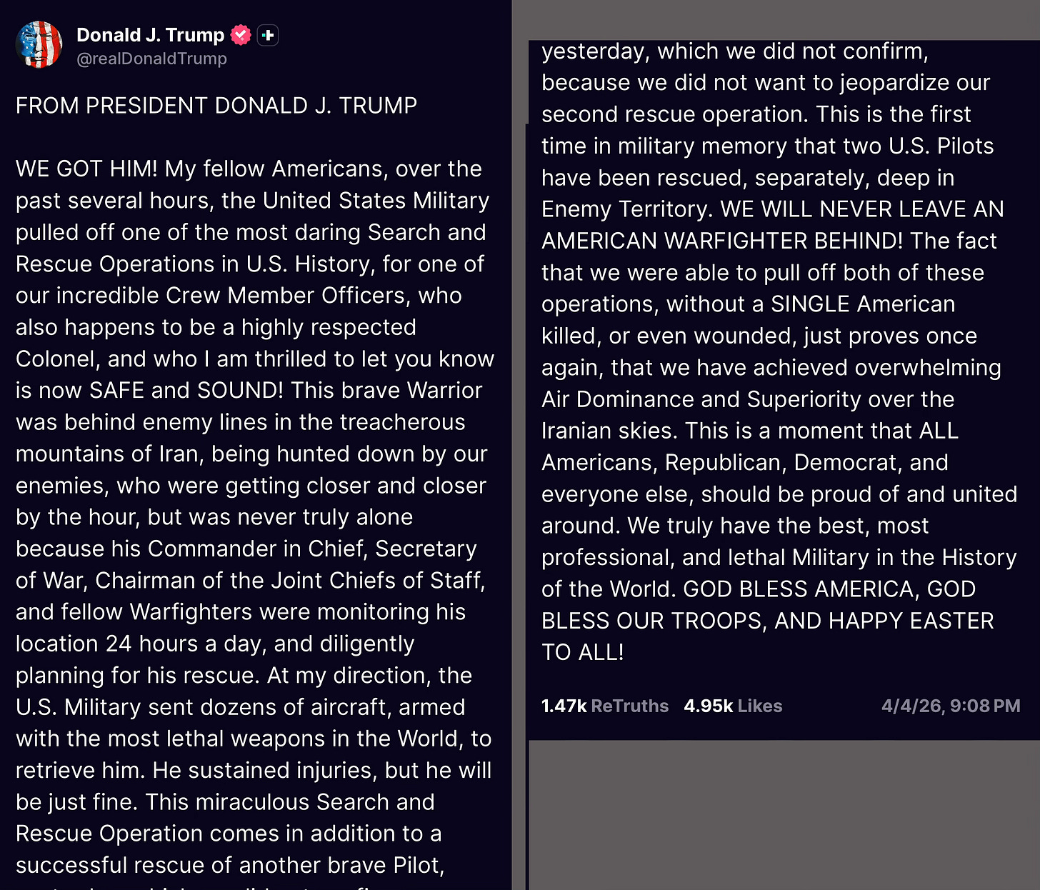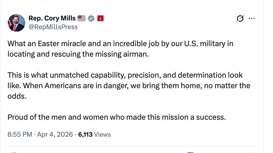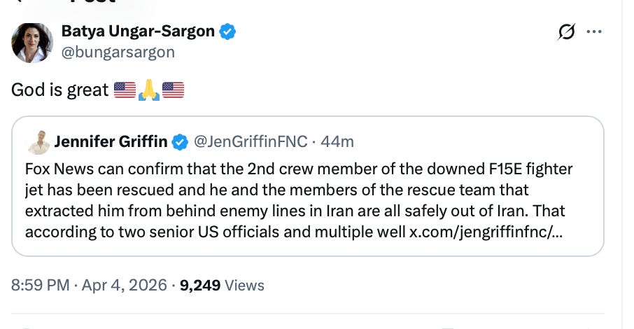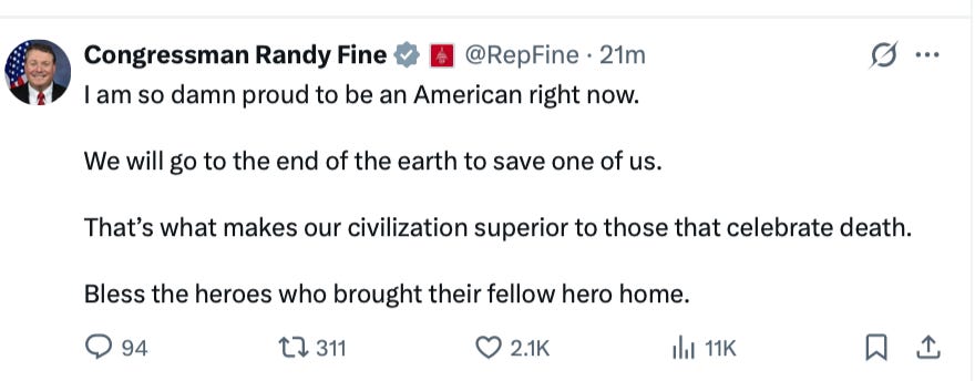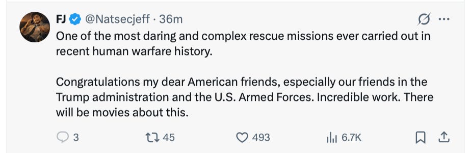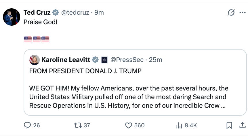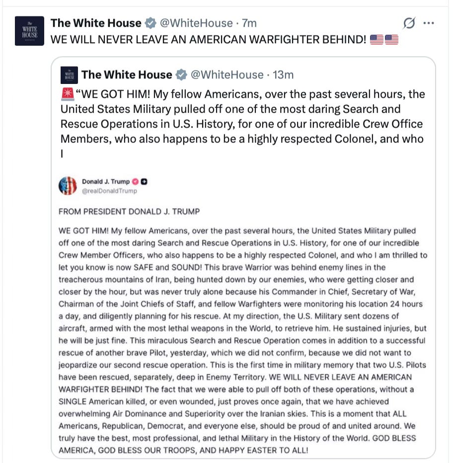 This is one of those days, which have been frequent with Trump, when you’re so proud to be an American you can barely stand it. God bless those brave souls who rescued this guy and God bless all our soldiers, sailors, Air Force and Marines who make us proud. What a great country!