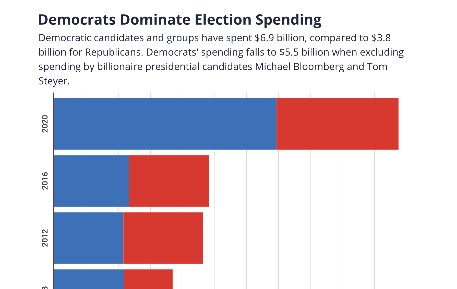 Top recipients: Joe BidenEmployees and PACs affiliated with Facebook donated a total of $6 million during the 2020 election cycle. More than 92 percent of the funds came from individuals. Mirroring Google’s and Microsoft’s partisan splits, Facebook spent nearly 80 percent of the funds on Democrats and only 10 percent on Republicans.