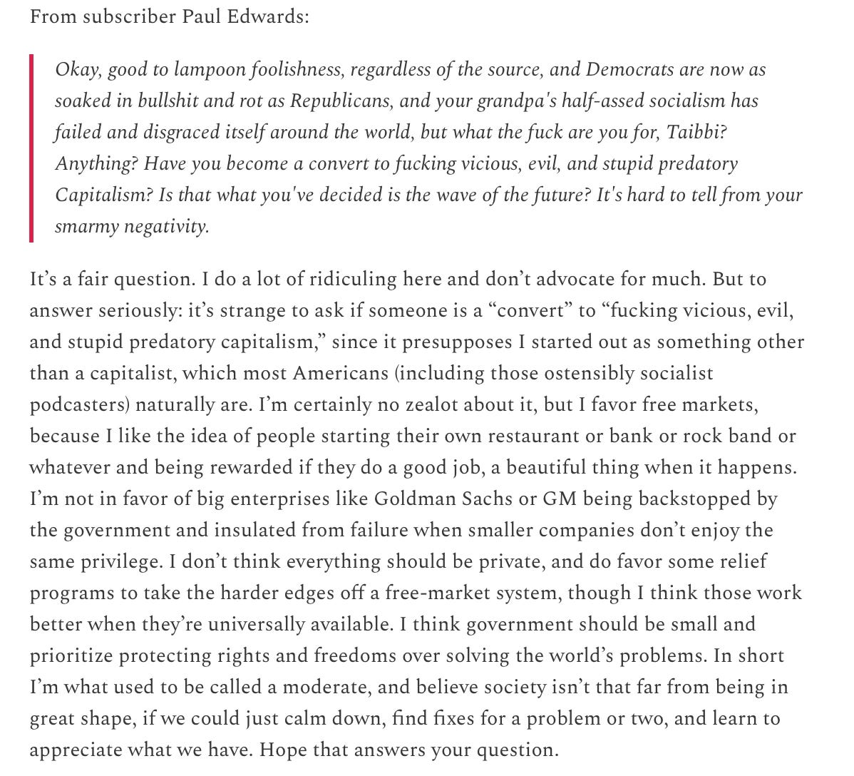 They come at Matt all of the time from the Left (and the Right) because they know he is a great writer and an honest person. Are there any good writers on the Left now? Not really. They’ve all been stuffed into the same conformist box and have become mostly unreadable. I’ll take a writer I don’t always agree with, but who thinks freely over whatever it is the Left has become.