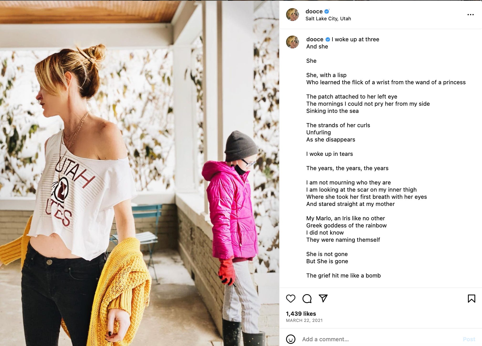 Dooce had two daughters. The younger daughter was Marlo (pictured above), the absolute girly girl. Dooce described this aspect of Marlo’s personality often. She loved tea parties, pink dresses, makeup, and princess costumes but had emerged in our post-2020 dystopia as a “non-binary they.”