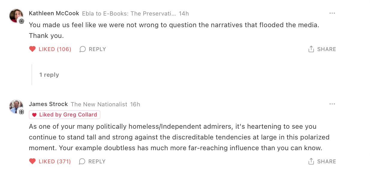 To say Matt’s readers are only Conservatives and MAGA is to betray your ignorance about the thriving ecosystem that exists outside the mainstream. If you don’t know that world, you can’t correctly assess it. Are there plenty of MAGA readers there, like there are on my Substack? Sure. There are also plenty of other kinds of readers, lapsed Leftists like me. It’s the quality of his work that draws readers.