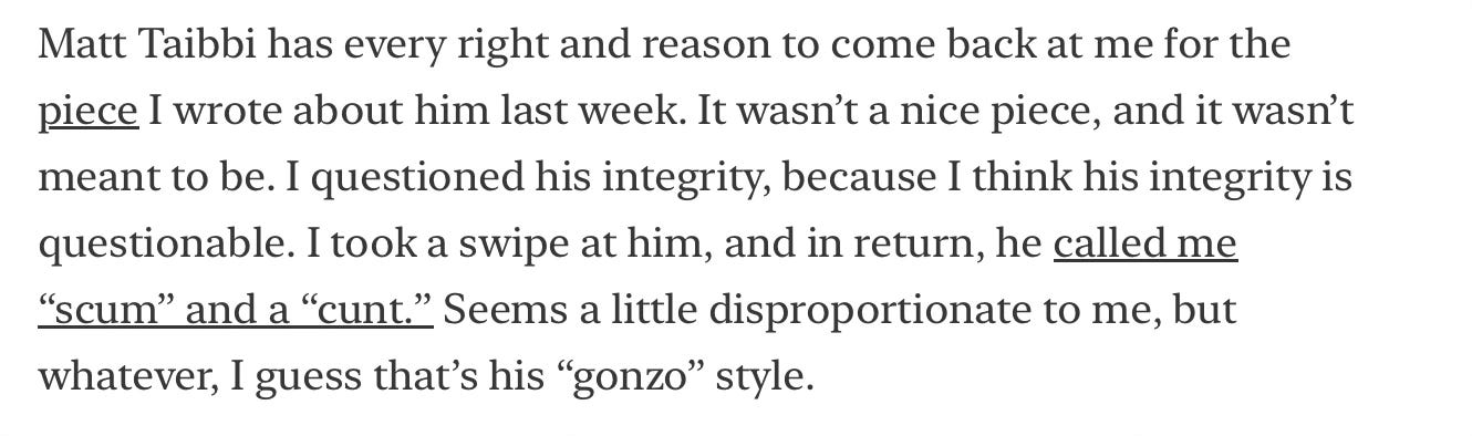 His hit piece on Matt Taibbi, whom he says he has “respect” for and calls a friend, before launching into a tirade about how Matt has sold out, is a victim of audience capture and has only Conservative and MAGA readers.