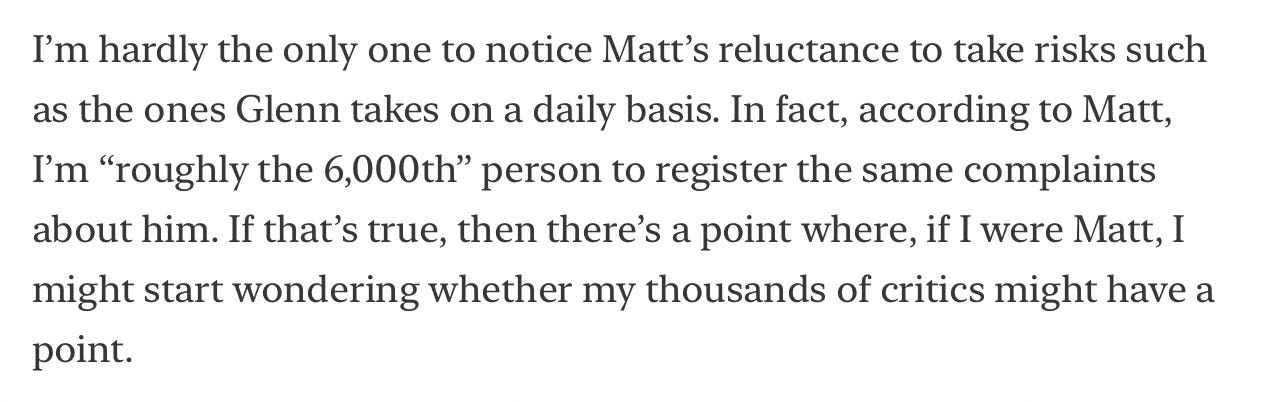 I don’t agree with everything Glenn or Matt says, and don’t need to agree with them. I trust them to tell me the truth about what they think. I think hit pieces are destructive and creepy, especially when they pretend to know the subject’s mind, as this one does.