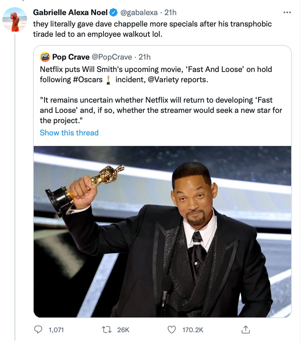 The Academy was trying so hard to boost its ratings and satisfy the Wokerati who watched every move they made, every joke told, and every fashion choice. Ever since 2020, people in positions of power have been terrified of losing that power, and the best way to do that is to make Twitter mad with some kind of transgression or to violate an accepted social norm.
