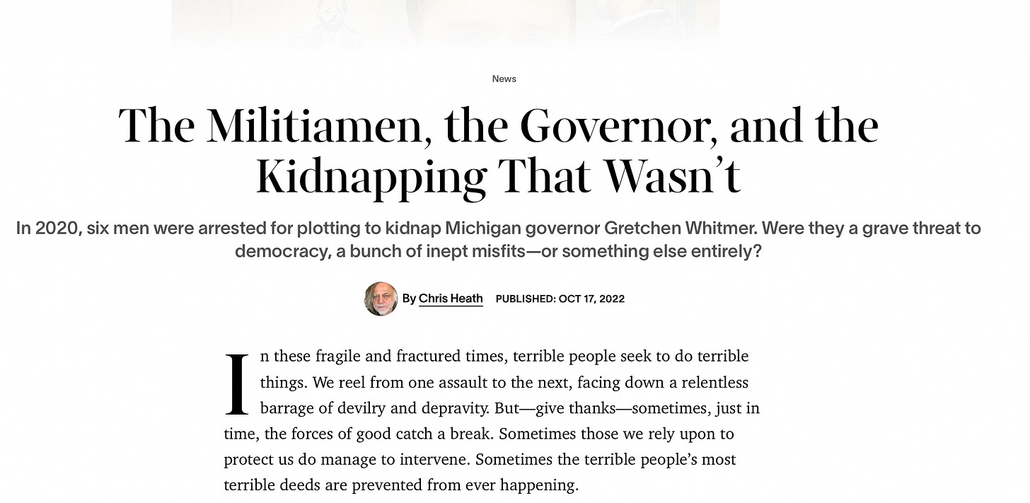 This piece in Esquire Magazine by Chris Heath is so good I almost can’t believe it was published. I didn’t expect it to be, in any way, fair-minded. We just don’t see that in journalism anymore. And yet, someone was reporting on a story about so-called extremists but being confronted with unexpected things, like his own humanity, contradictory facts, and the massive operation required to deliver necessary proof of extremism heading into the 2020 election.