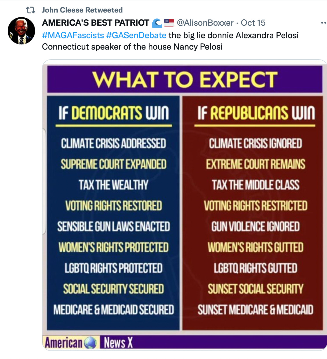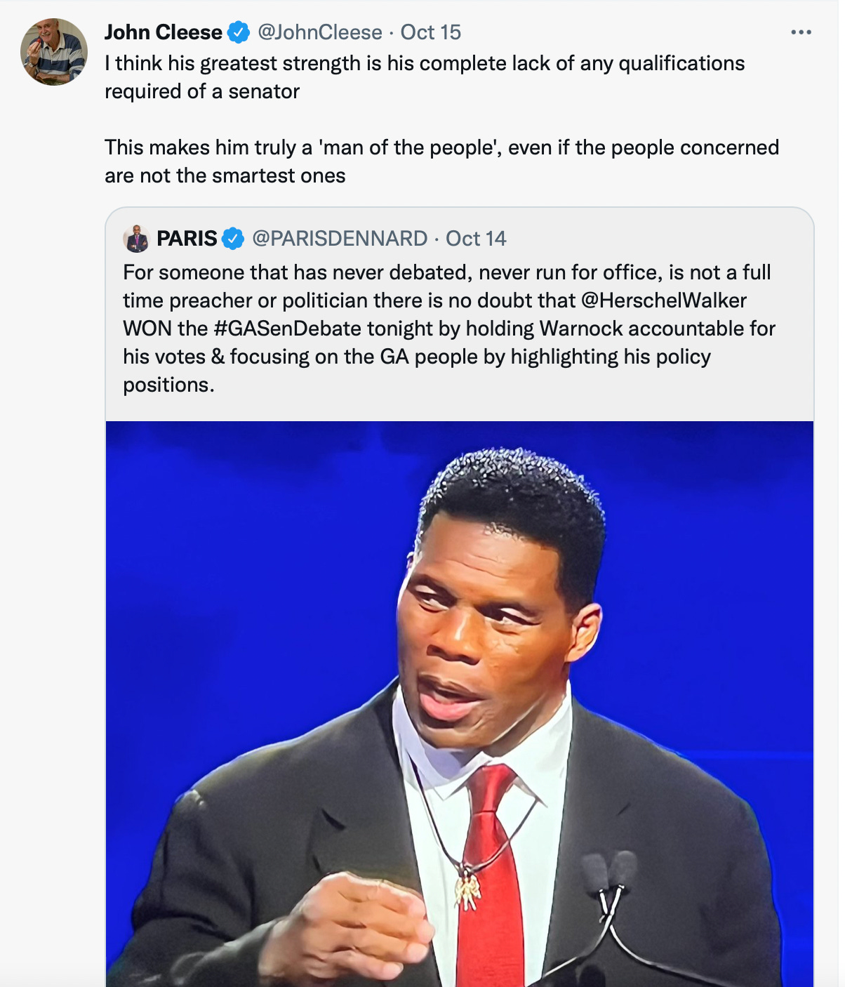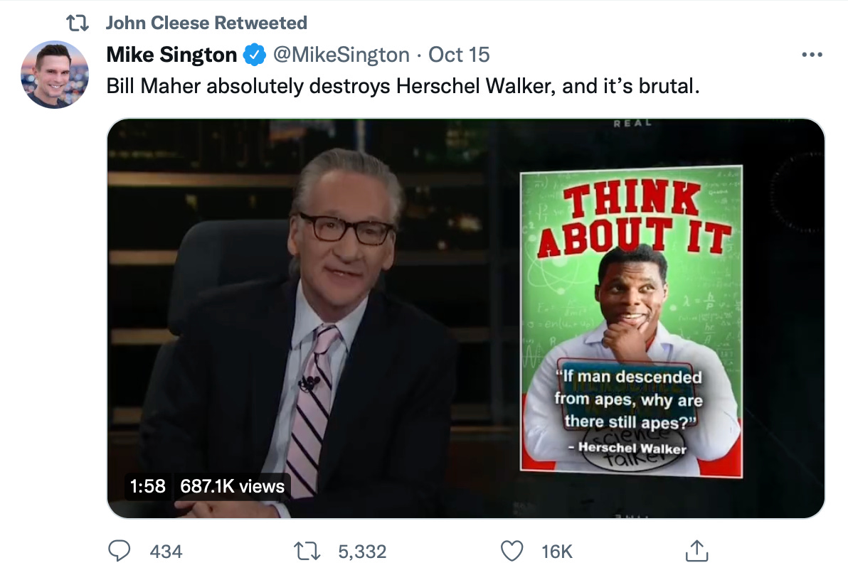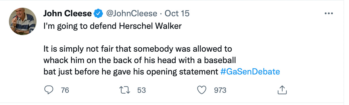 I can’t get too upset about John Cleese getting nailed. By mocking people, he gets his Twitter likes like every other blue-check. Thing is, it’s not funny. Not even a little. They make fun of Walker’s intelligence which is low-hanging fruit and, I think, unfair. Walker is doing what none of them have the nerve to do.