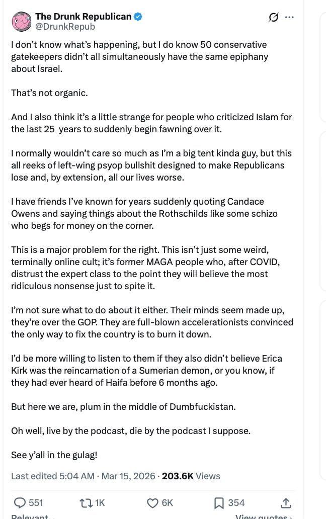 Your point about the “podcast lane” morphing into its own propaganda ecosystem is spot-on. Legacy media lost credibility by pushing the anti-Trump resistance; now parts of the Right are walking the same road—amplifying unhinged theories that blame Israel, TPUSA insiders, or even Erika herself for Charlie’s murder, despite clear evidence of a lone, ideologically driven shooter.