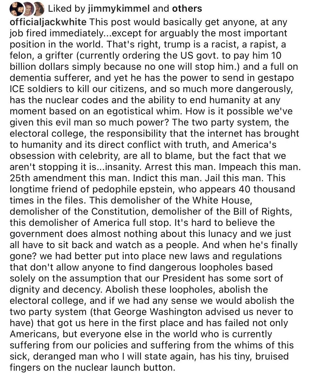 I look now at those still trapped inside the Doomsday Cult that I escaped, and I can’t believe the level of delusion. Look at this post by musician Jack White, which is liked by Jimmy Kimmel.