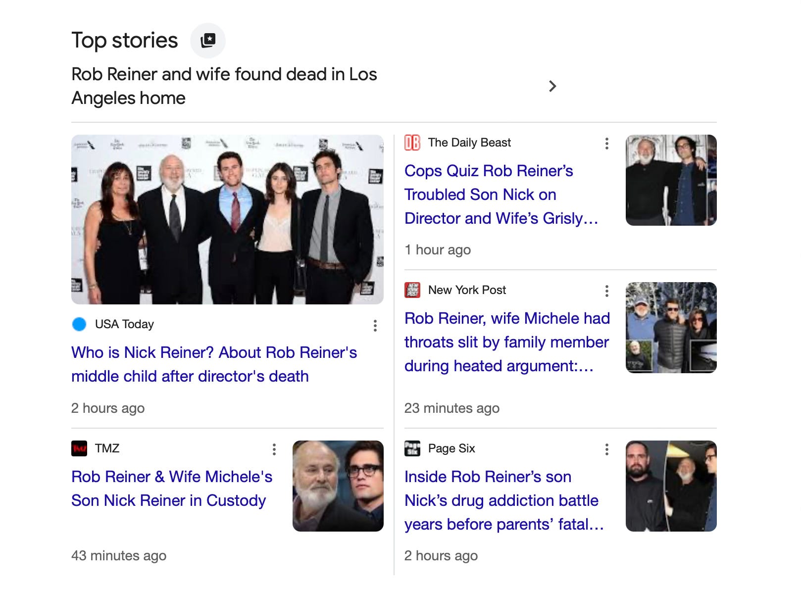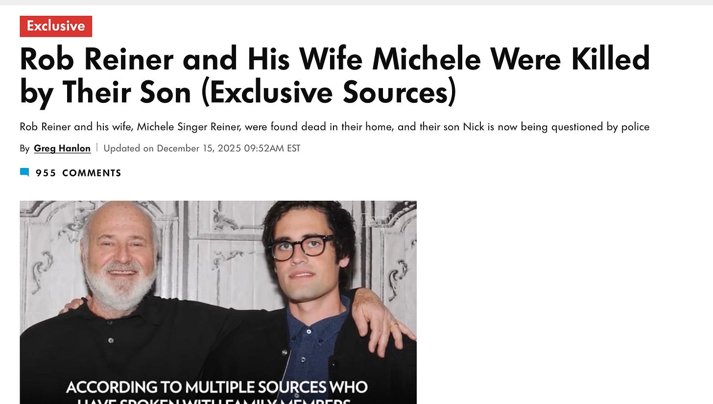 The story that Nick Reiner killed his parents broke on People magazine last night, though as of this morning, the headlines are still being cautious around it: