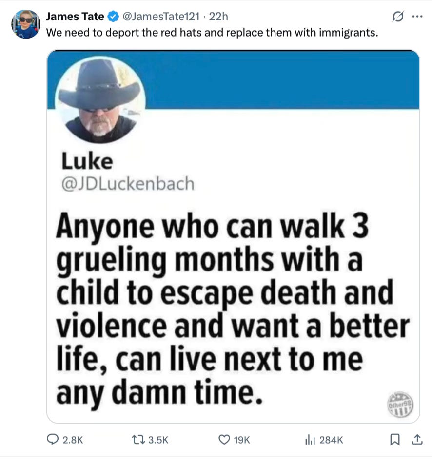 Oppression is the new free trade. Import the oppressed because rich people have run out of ways to give their lives meaning, while also sending them to work jobs they think Americans won’t do, not to mention supporting trade policies that exploit slave labor in other countries.