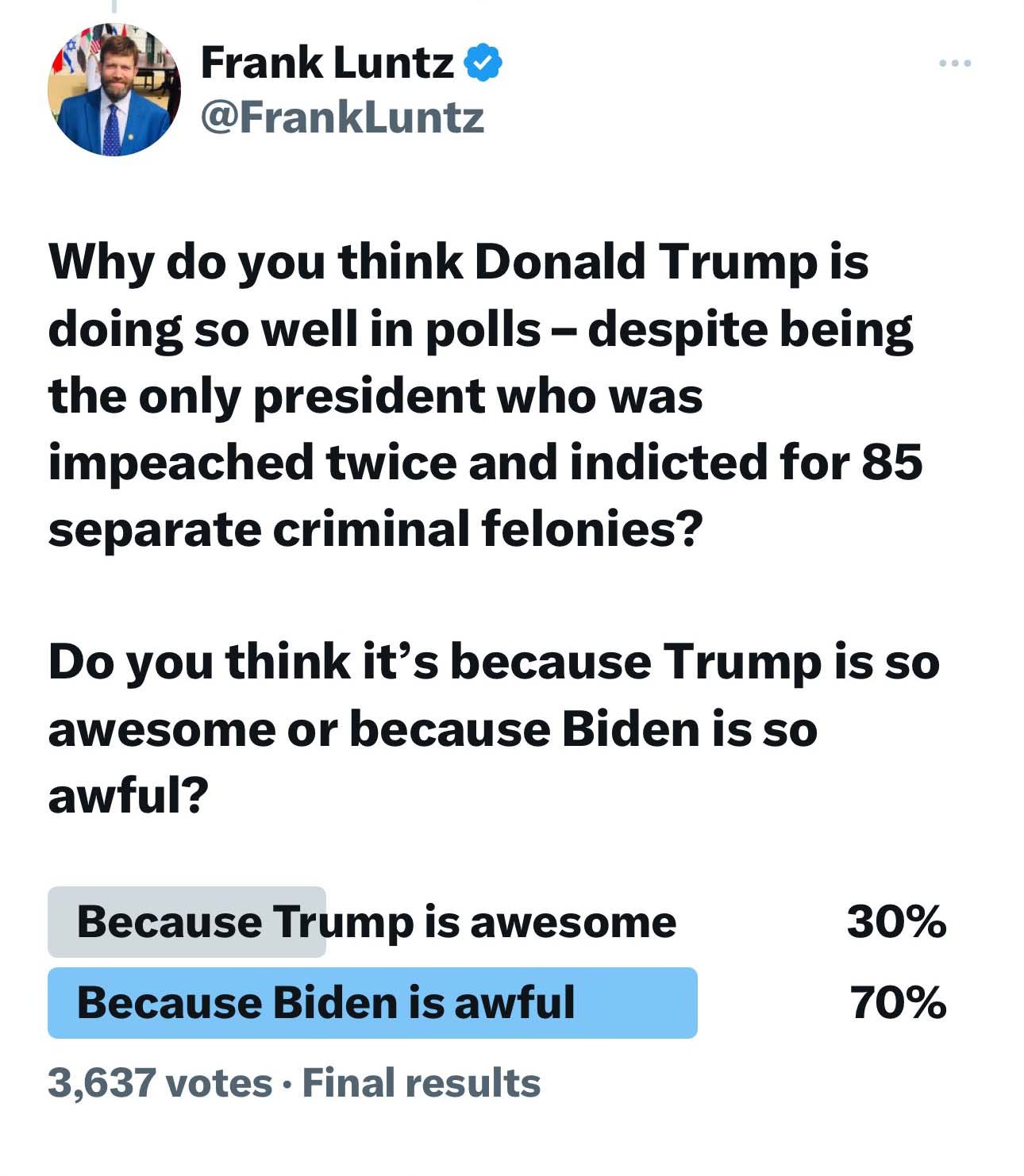 We like presidents to serve two terms. If the economy is bad, we vote them out after one term. They keep telling us Biden’s economy is going great, but that feels like gaslighting to most Americans. They remember Trump’s economy. If there is ever a reason for a pendulum swing, it’s that.