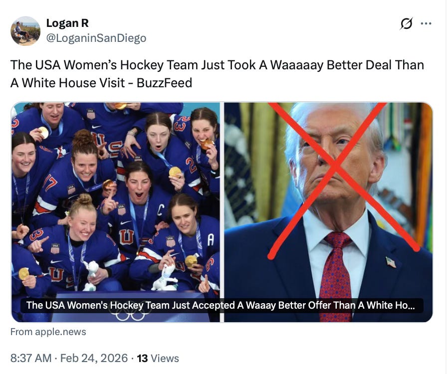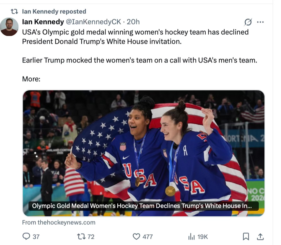 The women’s hockey team probably doesn’t really understand, or hasn’t been told, or doesn’t agree with what the Trump presidency has done for women’s sports, not to mention all of the young women who have a right to grow up with all of their body parts intact.
