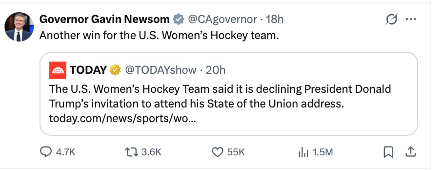 Gavin Newsom has proven himself to be too soft to be President of the United States. He’s decided that the women’s hockey team throwing a massive temper tantrum and not attending the State of the Union is the right call, as have many on the Left.