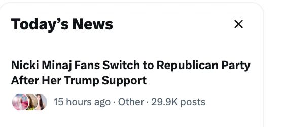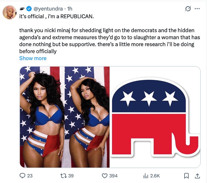 It likely derails the SAVE act, too, and loses him all the gains brought over by Nicki Minaj, and puts her in an extremely uncomfortable position after she took an enormous risk in supporting him.