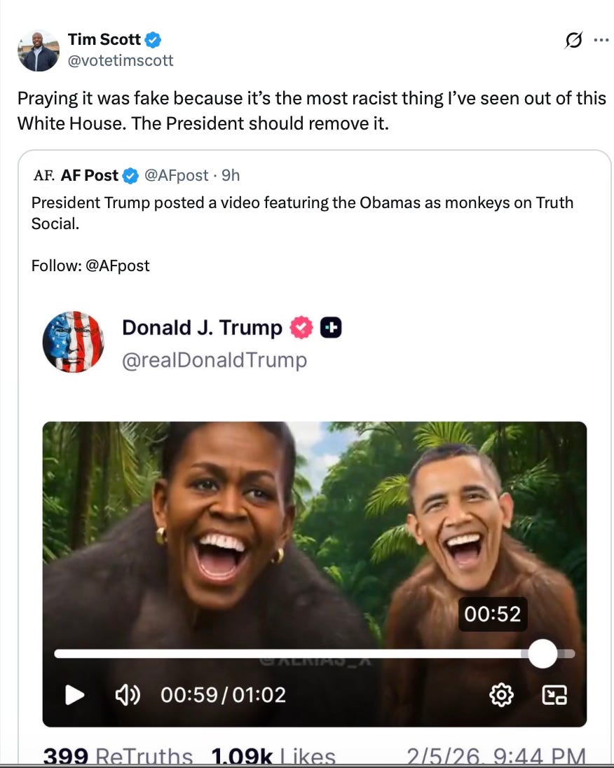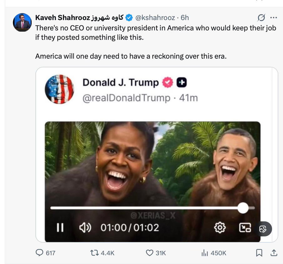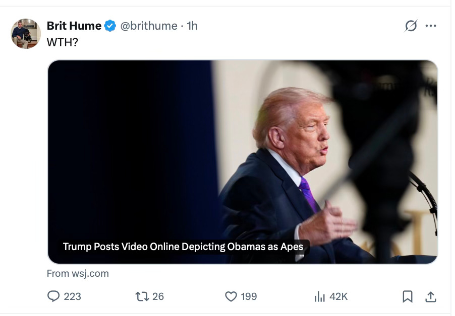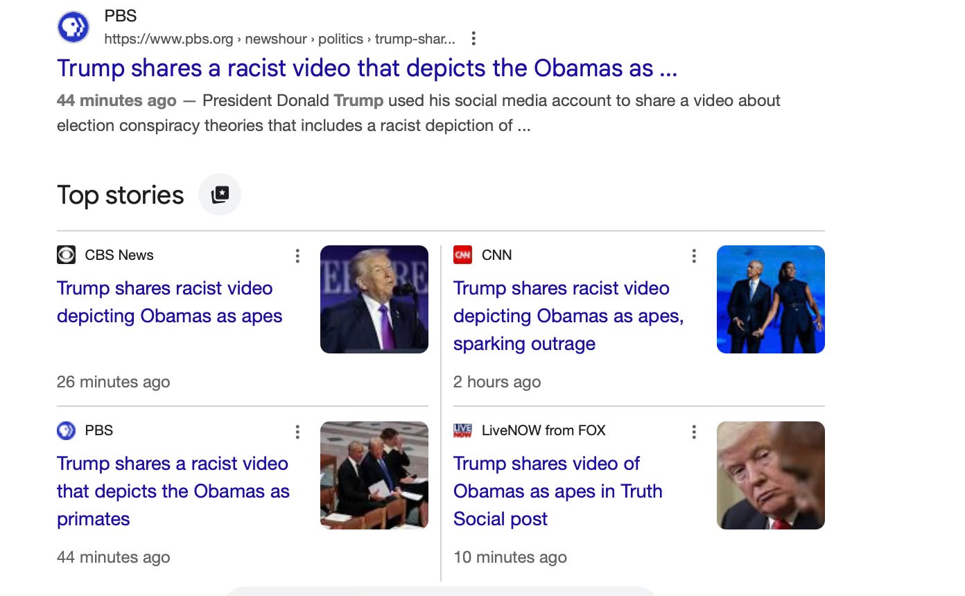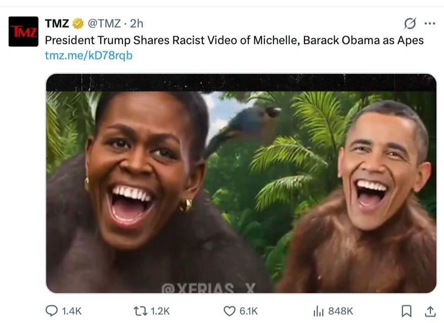 A story is breaking on X right now that shows a video posted by Trump about voting. At the end of the video is an animated image of the Obamas as monkeys. Trump should have deleted. He should delete it because it’s the right thing to do. He also knows it doesn’t matter if he deletes it or not; the end result will be the same. The fact is, he walked into a trap.