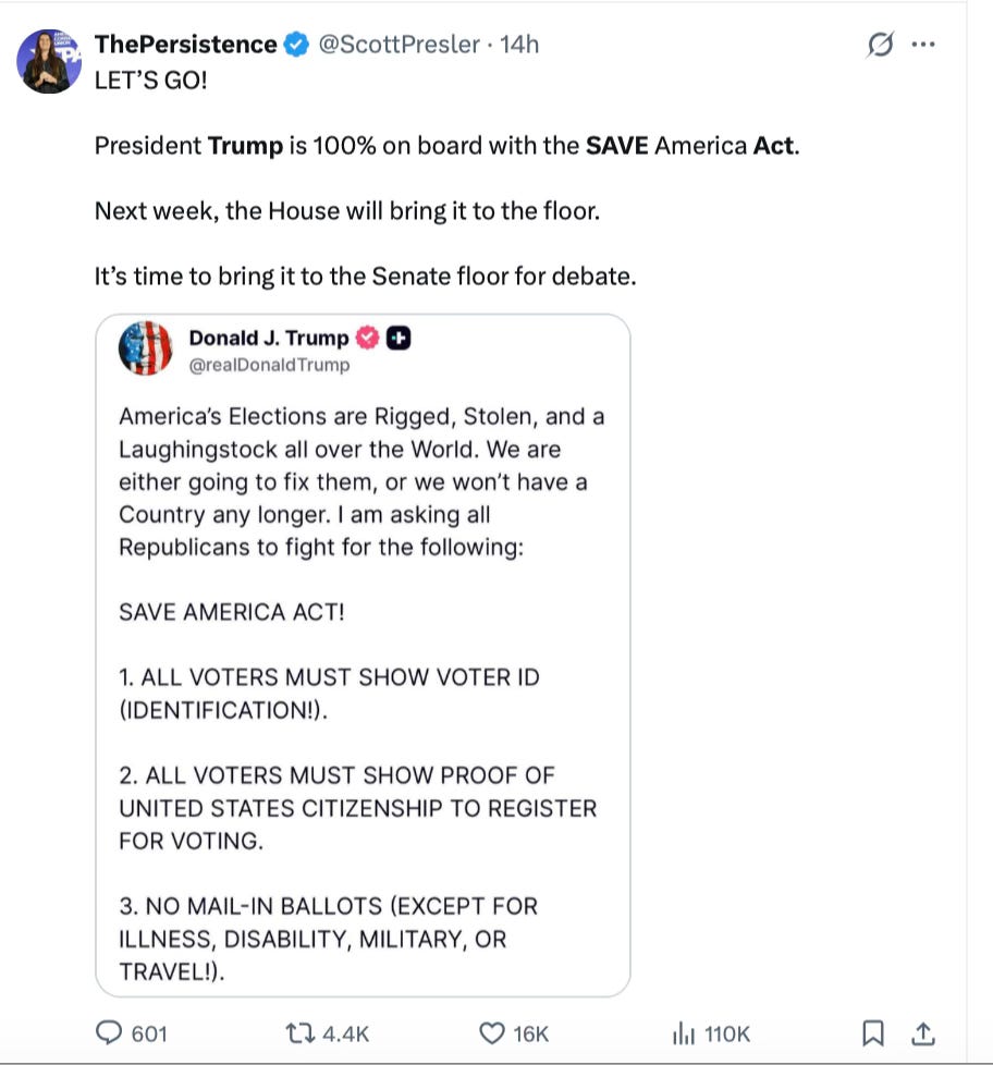 Setting up Trump is like shooting fish in a barrel. It’s not hard to find something Trump will want to post, and it’s not outside the realm of possibility that he’d post something with a two-second image at the end. Trump wanted it to be about voting so he could pass the SAVE Act, which he was moving toward doing. You know, the one the Democrats call “Jim Crow 2.0”? That is what Trump was preparing to do before this story hit.